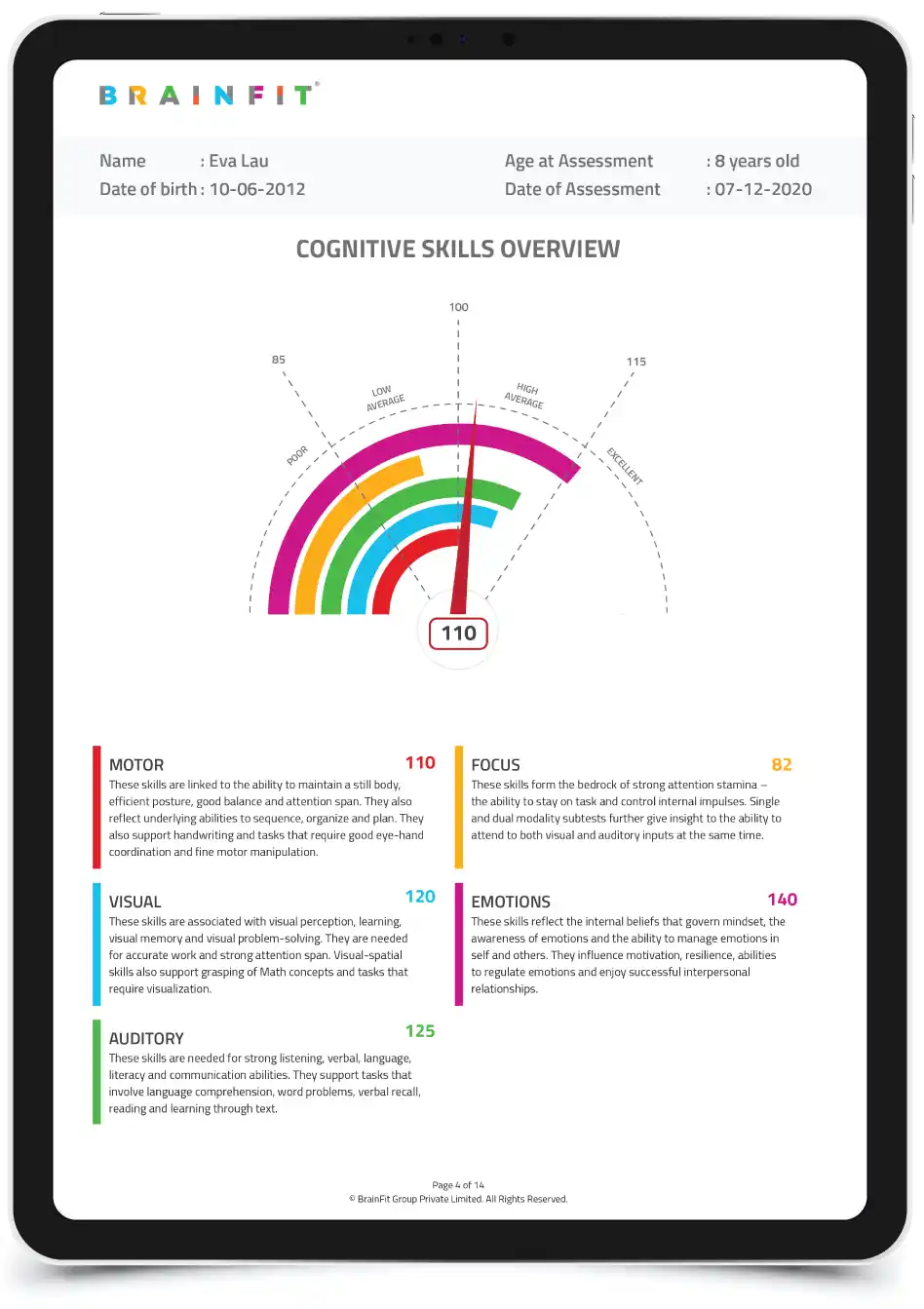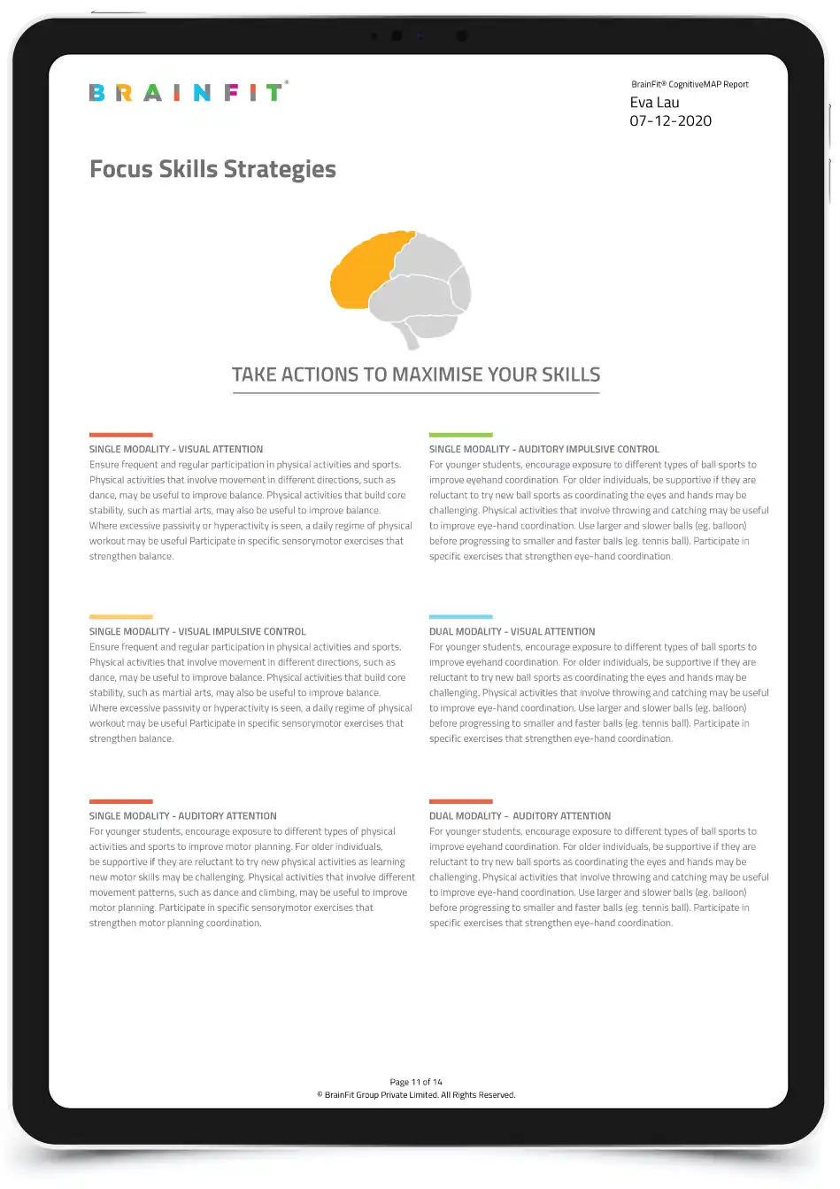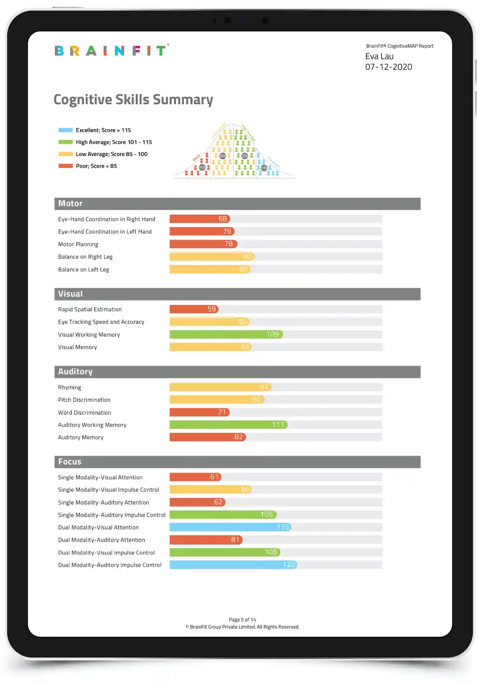 TESTÇocukların her biri benzersiz ve bireysel beyin yeteneğine sahip olduğundan, BrainFit, dikkat süreçlerinin yanı sıra, düşünme ve öğrenme süreçlerinde yer alan çeşitli bilişsel yetenekleri, güçlü yönleri ve zayıf noktaları belirlemek amacıyla CogMAP Zihin Check-up Değerlendirmesi uygular.